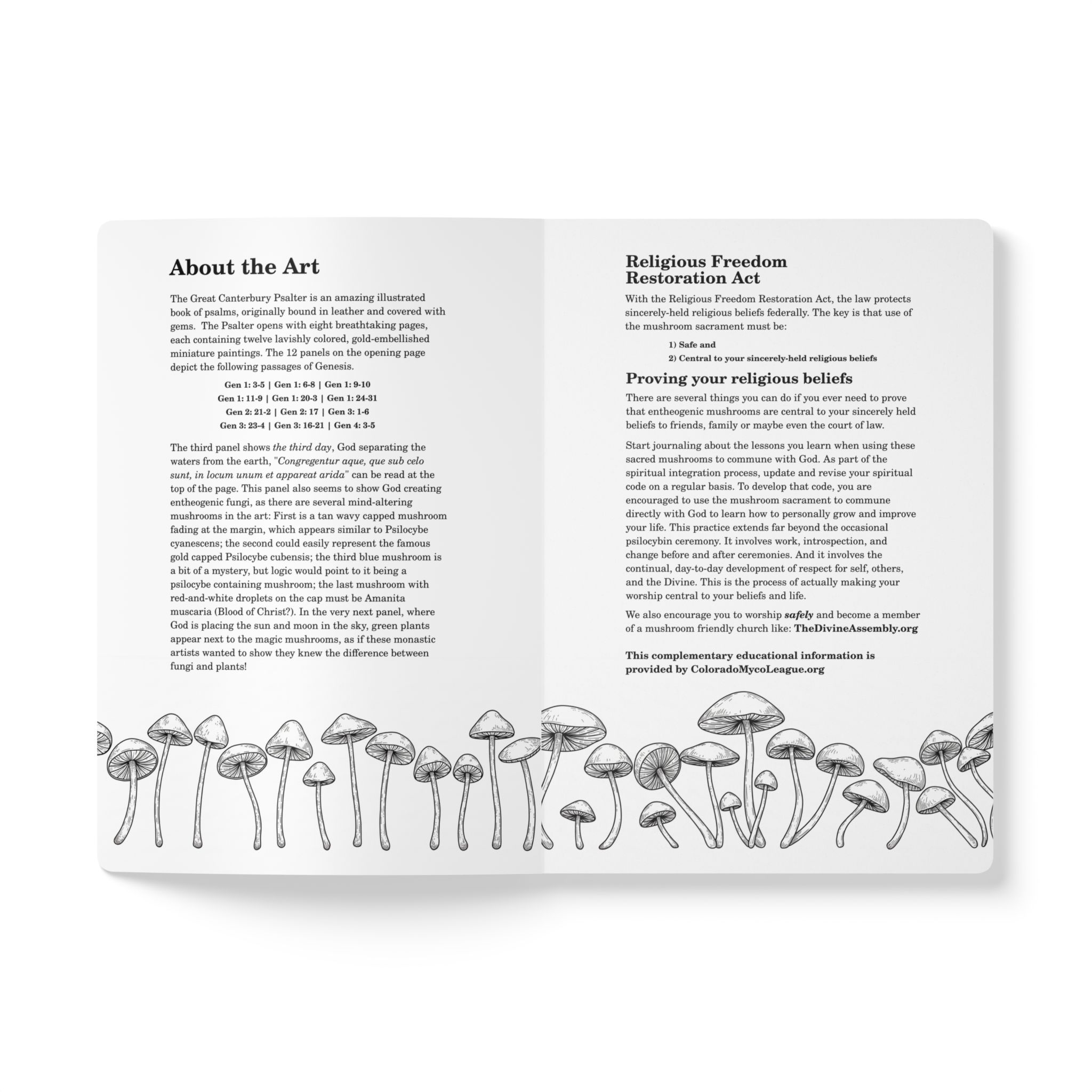 This soft cover journal comes perfectly sized at 5.75″ x 8″ (14.6 x 20.3 cm) and is available with 100 or 200 pages (50 or 100 sheets) to suit everyone’s note-taking needs. The journal features a luxuriously soft satin finish cover with rounded corners for a sophisticated touch. The outside cover of the journal depicts religious mushroom art from the Great Canterbury Psalter. The inside cover and the first page contain complementary information explaining the cover art and how you can use the Religious Freedom Restoration Act in conjunction with this journal to aid your religious goals.